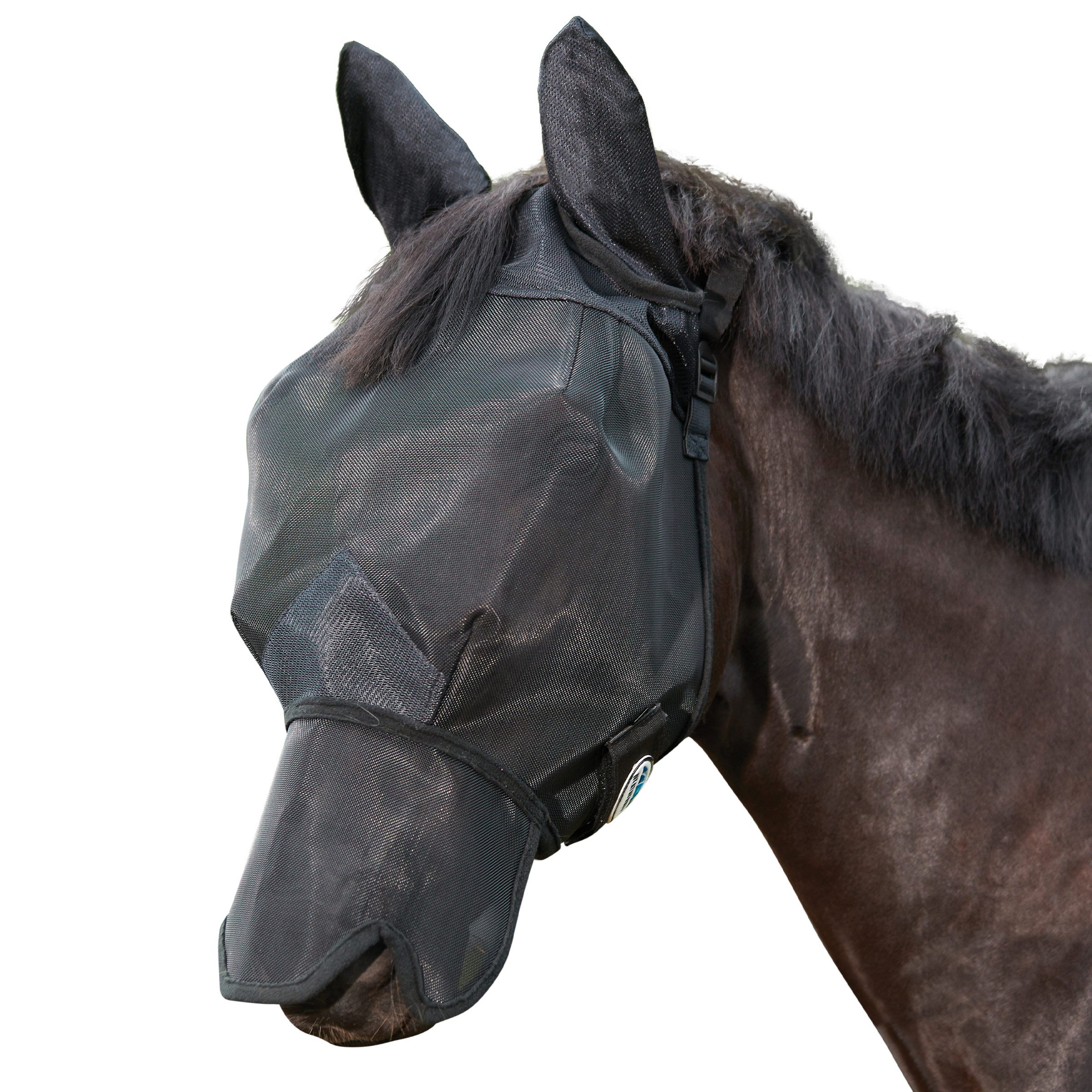 Die WeatherBeeta ComFiTec Double Dart Deluxe Fliegenmaske mit Ohren- und Nasenschutz ist eine strapazierfähige Maske aus feinem Netzgewebe, die das Gesicht, die Ohren und die Nase Ihres Pferdes bequem vor lästigen Fliegen und Insekten schützt. Dank doppelter Abnäher über beiden Augen sitzt die Maske nicht direkt auf dem Gesicht des Pferdes und bietet dennoch eine konturierte Passform; das feine Nylongewebe staut keine Wärme und behält seine Form. Mit einem weichen Airstream-Material über den Ohren und im Stirnbereich für verbesserte Luftzirkulation sowie einer Schopföffnung.